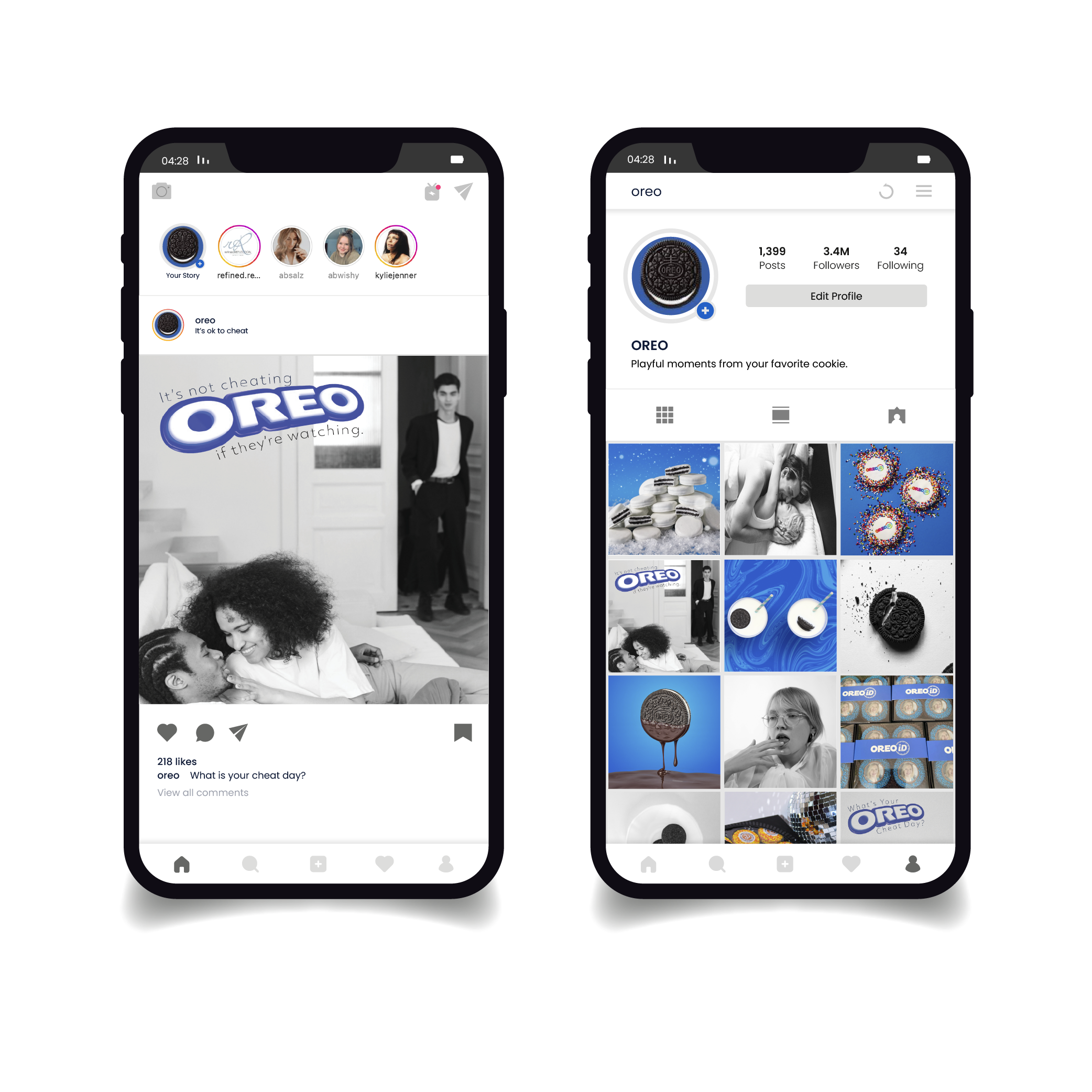 The social media includes an aesthetic of posts on Oreo’s Instagram account and two ads for a dating app called Tinder.